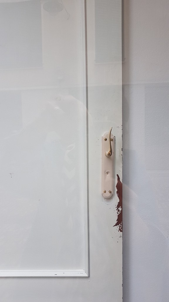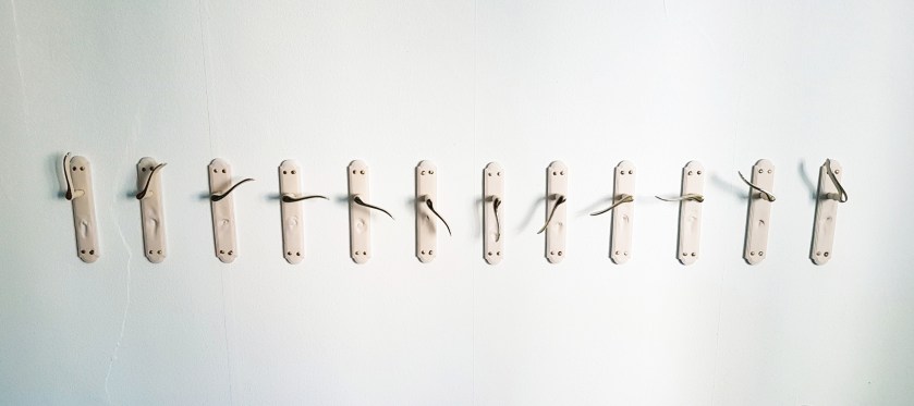 This installation consists of 12 door handles with gold-plated handles that move clockwise.