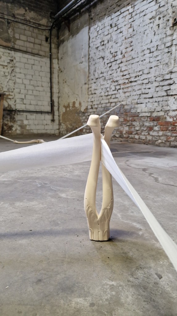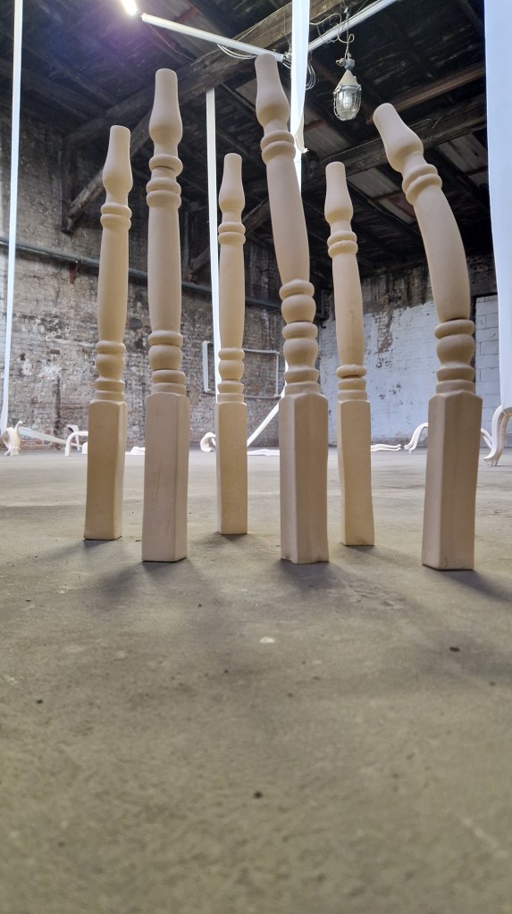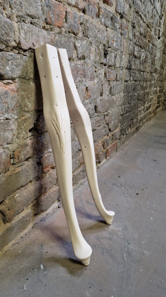 En el proyecto «Piernas», utilizo la metáfora de «la pata de la mesa» de manera literal, pero estas patas no son cualquier objeto funcional. Son patas femeninas, que reflejan la flexibilidad, la capacidad de adaptarse y ceder sin romperse, características que históricamente se han asociado a la mujer, tanto en su cuerpo como en su rol social. Estas patas, provenientes de diferentes épocas, no solo aluden al paso del tiempo, sino también a cómo la resistencia y el sacrificio han sido modelados en el contexto femenino: una flexibilidad que, a menudo, es interpretada como fortaleza, pero que puede resultar en una sobrecarga silenciosa.