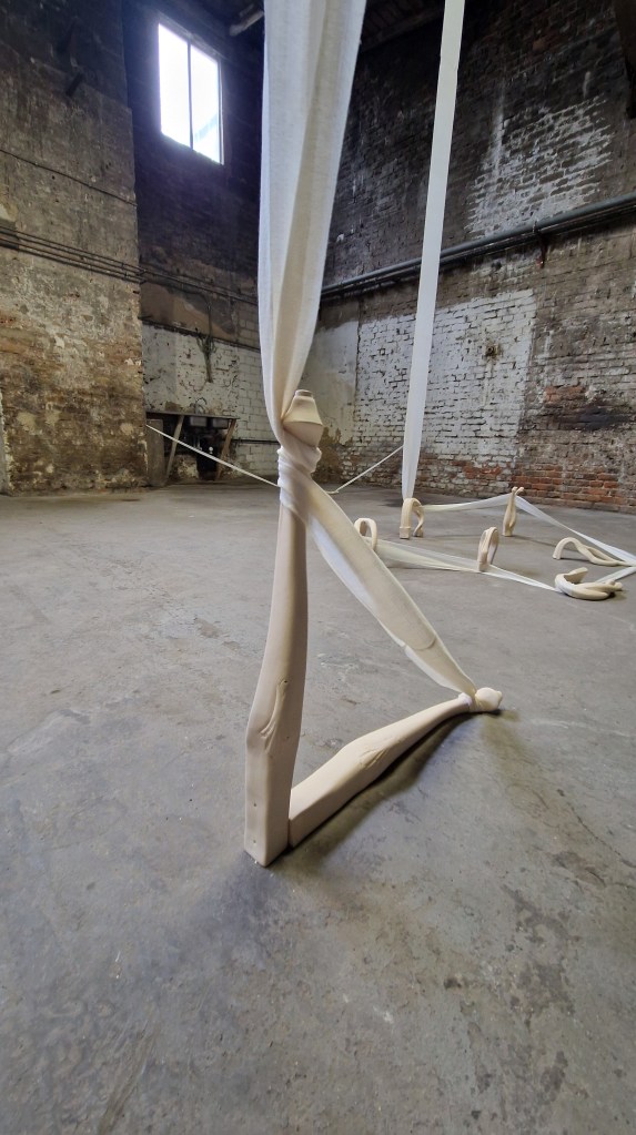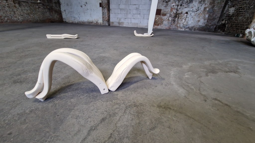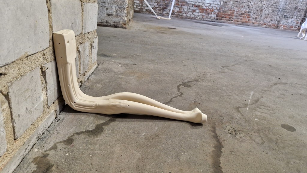 These assembled pieces, bent and curved to the breaking point, convey not only physical fatigue but also mental exhaustion. They reflect both the heaviness of weariness and the relief of rest. But they also speak of a body shaped by expectations that can no longer be upheld. Just as women’s flexibility has historically been valued but also exploited, these table legs seem to cry out for the urgent need to break free from constant pressure—to break the endless cycle of productivity and to make space for rest and disconnection.