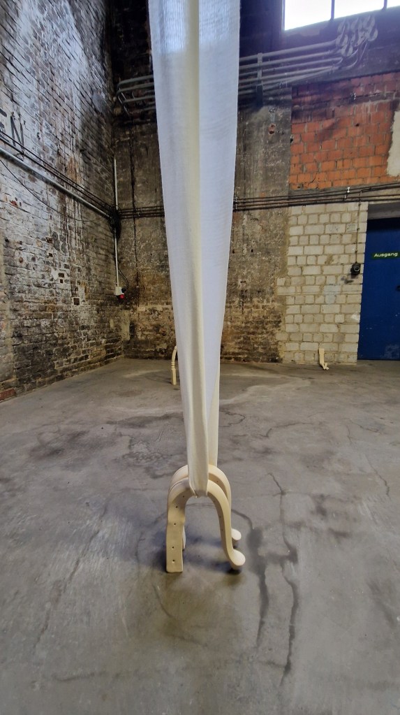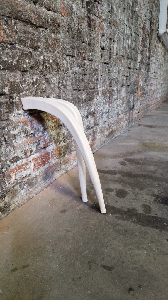 Estas piezas ensambladas, curvadas y dobladas hasta el límite, transmiten la fatiga no solo física, sino también psíquica. Reflejan tanto la pesadez del agotamiento como el alivio del descanso. Pero también nos hablan de un cuerpo que ha sido moldeado por expectativas que ya no pueden ser sostenidas. Al igual que la mujer, cuya flexibilidad ha sido históricamente valorada pero a la vez explotada, estas patas de mesa parecen gritar la necesidad urgente de liberarse de la presión, de romper con el ciclo interminable de actividad y de encontrar espacio para el reposo, para la desconexión.