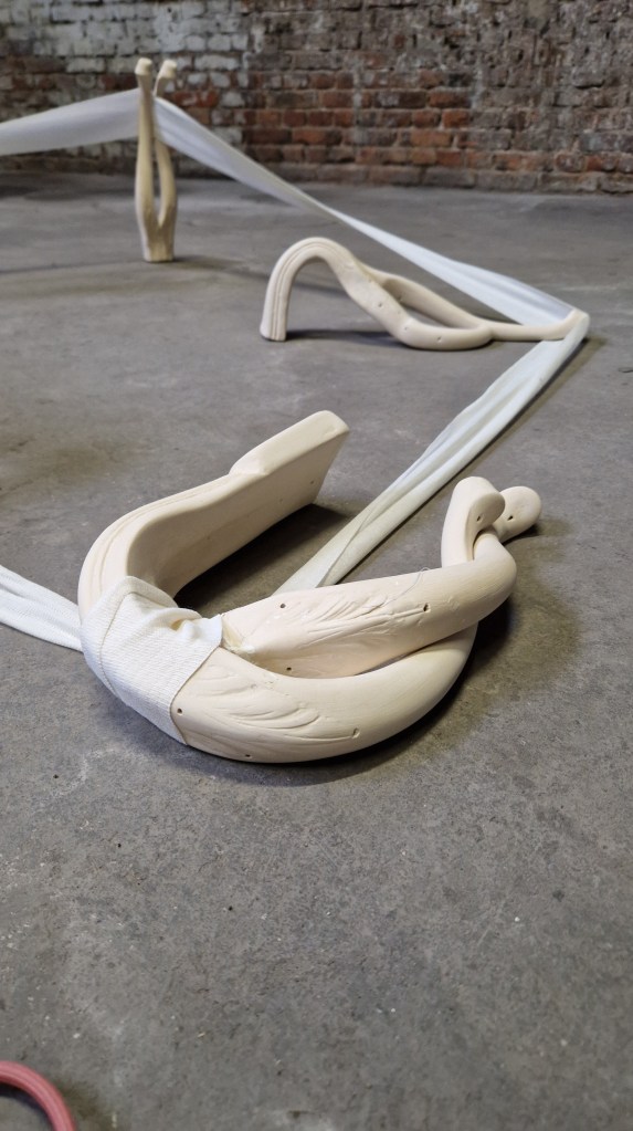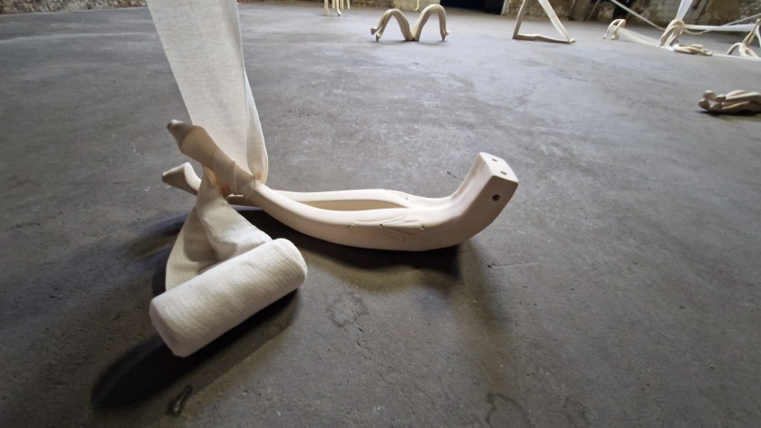 Cada pata de mesa tiene su historia, su propio desgaste, pero todas comparten una característica: la deformación. La flexibilidad, representada en estas formas curvadas, dobladas, es a la vez una muestra de resistencia y vulnerabilidad, de un cuerpo que cede ante las presiones de una sociedad que exige sin pausa, pero que también requiere descanso. Estas patas se transforman en piezas únicas de barro, hechas a mano y sin esmaltar, donde el acabado imperfecto refleja ese mismo abandono de la perfección que define la experiencia humana ante la sobrecarga de demandas. En este contexto, las patas de mesa, tan flexibles, parecen reclamar el derecho a descansar, a no ser constantemente útiles, a no estar siempre en pie, a no ser siempre la base de algo más.