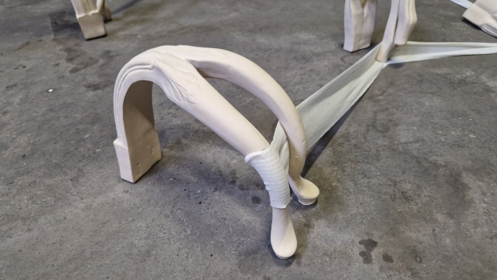 Each table leg carries its own story, its own wear and tear, yet all share one common feature: deformation. Flexibility, as seen in these curved and bent forms, is both a sign of resistance and vulnerability—a body that yields under the pressures of a society that demands without pause, but also requires rest. These legs are transformed into unique, hand-crafted, unglazed clay pieces, where the unfinished surfaces reflect the same abandonment of perfection that defines the human experience when faced with overwhelming demands. In this context, the table legs, with their inherent flexibility, seem to demand the right to rest—to not always be useful, to not always bear the weight of something else.