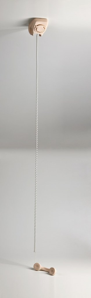 Es el segundo trabajo que se sitúa en el techo y nos habla de las formas de comunicación interna y externas a través de un objeto de uso común como es un teléfono. Es una metáfora acerca del diálogo interior que mantenemos diariamente con nosotros mismos, estos diálogos acostumbran a estar cargados de creencias certezas y juicios. A la vez el teléfono analógico nos transporta al pasado en donde no podíamos imaginar un presente tecnológico como el que vivimos en estos momentos. Y nos preguntamos… ¿que tipo de dispositivos utilizaremos en el futuro ? ¿cómo y con quién podremos comunicarnos? ….