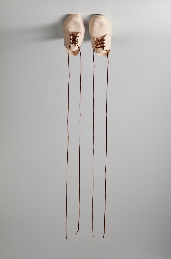 Los zapatos representan una base, un cimiento, un objeto que nos ayuda a plantarnos firmemente sobre el suelo y por ende representan los ideales que nos sostienen. Al mismo tiempo simbolizan sobrevivencia, acción y movimiento.El zapato es una metáfora de nuestro actuar y decidir, de las actitudes que adoptamos para avanzar por la vida en tiempos de obstáculos y de calma. Zapatos en el techo. «Pequeños cambios sostenidos en el tiempo…» pretende dar un giro a lo aprendido, a cuestionar nuestras creencias y a ser libre. El avance, la transformación y la dirección de la vida, a lo visto y por ver; fantasías, imaginarios y sueños.
